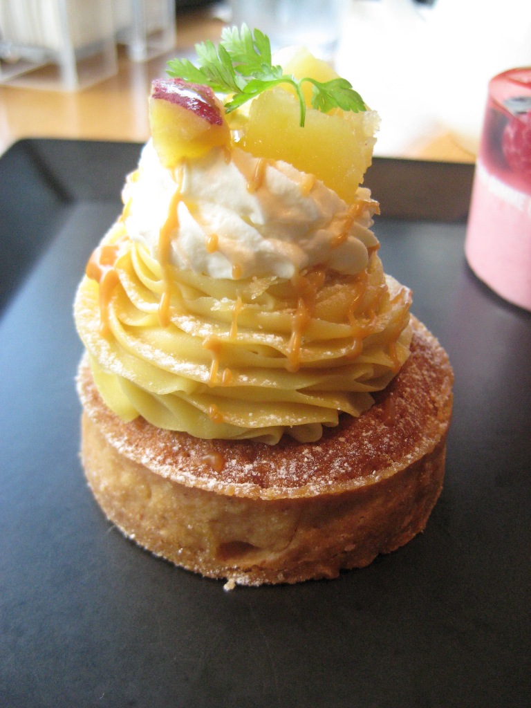 サツマイモのモンブランタルト。 女性は概してお芋とカボチャがすき♪ そして男性でこれらが好きな人は少ない。 世の中の七不思議