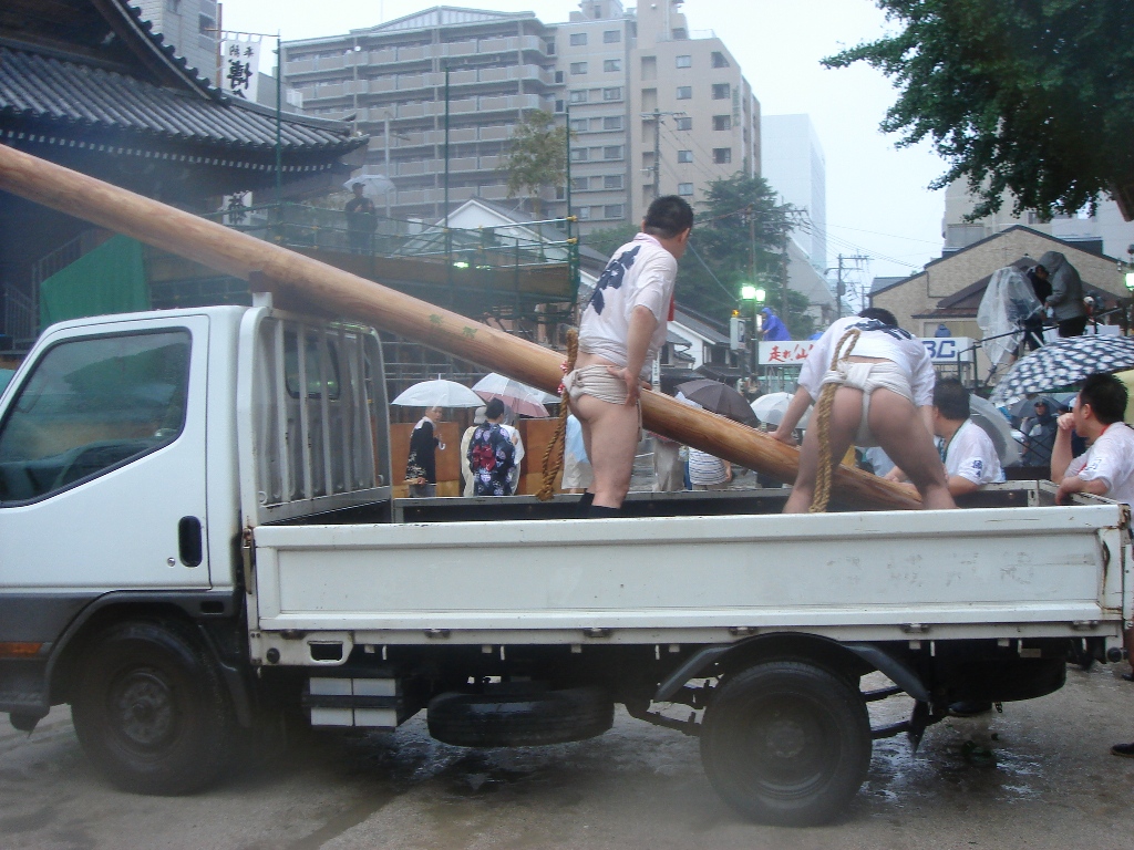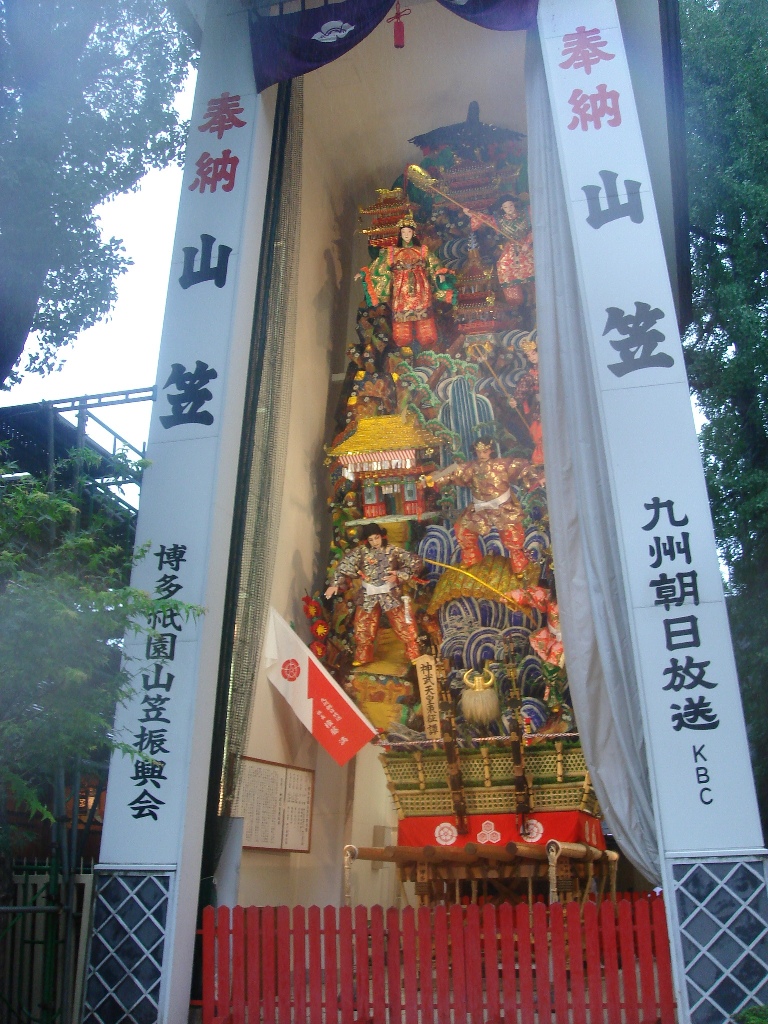 注:去年(2007年)の話です。 今年のものは写真撮れそうにないので・・・。 山笠~祭りの後 TVで勇壮な、鬼のような形相で必死に街を駆け抜けた男衆の熱気にあてられて、いてもたってもいられずに街に繰り出しました。 自分の部屋の最寄りの地下鉄駅から電車に乗り込みます。 外は雨ザーザーだけれども涼しくて気持ちがよいです。 夜も明け始めて白み始める空。 朝早いのでガラガラです♪ と思ったら、千代県庁口位からどんどん人が乗ってきてすしずめ状態に(爆)) う~ん、アマウサも含めてみんな祭りバカで遊んでますね♪ 仲間です! (勝手なアマウサ的思考回路) 中洲川端で降りて、川端商店街のアーケードを通って櫛田神社へ向かいました。 祭りが終わり駅に向かう人の波をかき分けていきます。 逆行する女アマウサ。 途中で水法被の若いお兄さんを彼女が写真に収めているのを目撃。彼氏の方は満足げな様子。 冷やかしたい気持ちを抑えて進みます。 アーケード内に設置された山用のテント(?)でかき手の皆さんたちがビールと甘いお菓子と料理で打ち上げをしている現場にも遭遇。 使用後の山。 山を運んできた後、オイサ、オイサの掛け声とともにこの集団は去っていきました。 デジカメのムービーでもとったのですが、HPにアップする技術がないのでこの写真を代表でのせておきます。 AM6:00から荒神 ( あらぶるかみ )を鎮めるために【鎮めの能」を奉納します。 見たのは終わりの15分くらいでしたが、なかなか雰囲気あります。 笛の音も素敵で、おじ様の扇裁きが見事でした。 肖像権とか心配なので雰囲気を伝える写真は終了後の櫛田神社の能楽堂。 後片付けも大切ですね。 素敵な時間をありがとうございました。 櫛田神社の飾り山。 豪華~! 是非とも伝統を受け継いでください