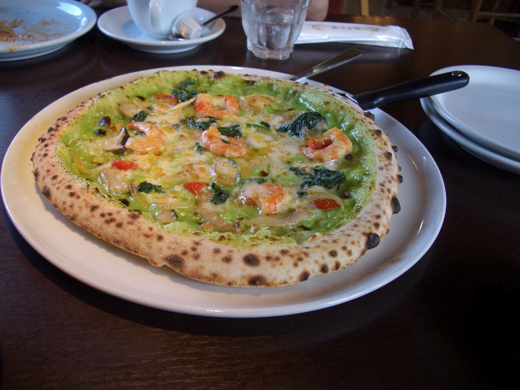 絶品ピザ。 石賀まで焼いてある生地がモチモチしていて幸せにしてくれます。 写真はほうれん草のソースとえびのトッピングです。 ドライトマトもアクセント。