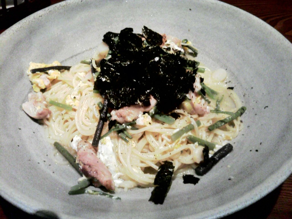 和風のパスタ。 細い麺がうれしい。 福岡の天神にあるお店。 女性が多かったのですが、皆さんおいしいところはちゃんと知っているのですね(笑)